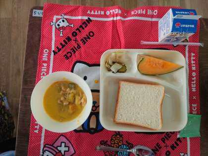 パンです。今日はメロンがついています。8等分に切られています。パンも美味しそうに食べていました。