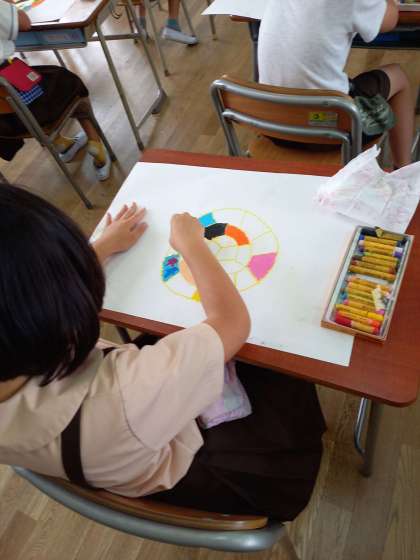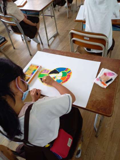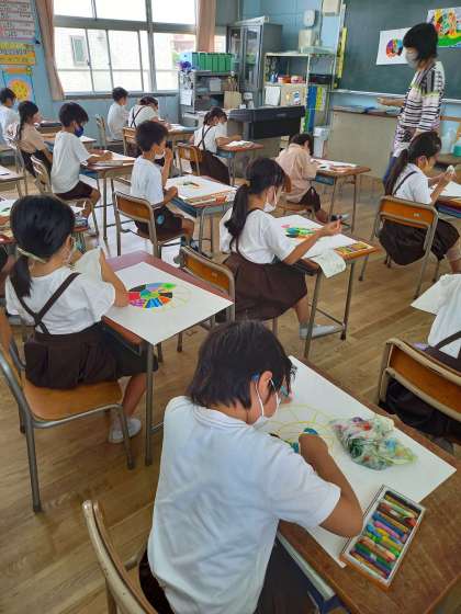 2年1組はパスを塗り込んで、おしゃれなカタツムリを描いていましたよ。枠の線をはみ出さないように気をつけてがんばっていましたよ。