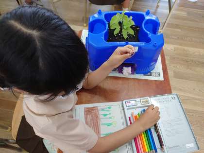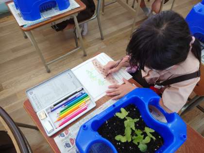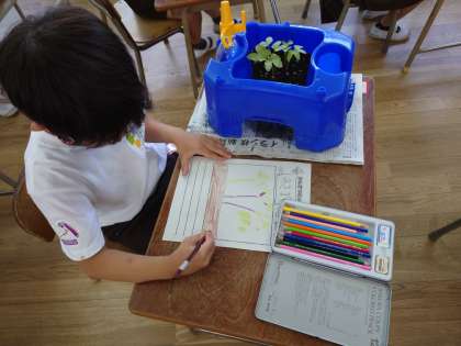 一年生はアサガオの絵をかいていました。毎日お水やりをしていて、どんどん成長しています。