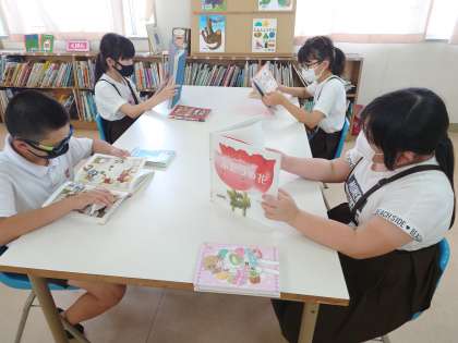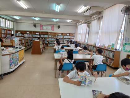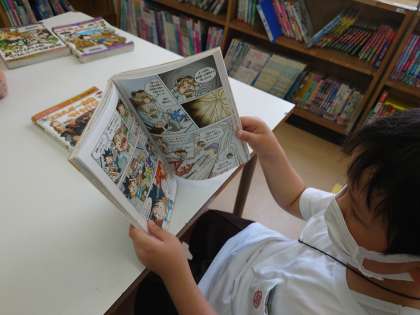 図書室に行くと静かに本を読んでいました。四年生ではサバイバルの本が人気があるようです。