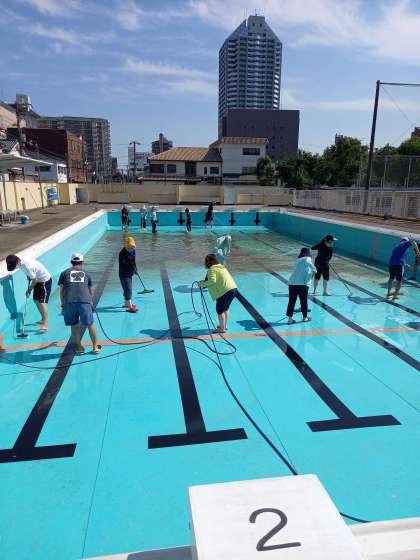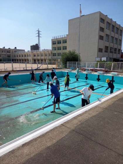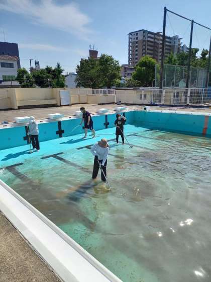 来週からプールが始まるので、本日教職員で、プール清掃をしました。事前に管理作業員さんが掃除していただいたおかげで、スムーズに進み、きれいになりました。