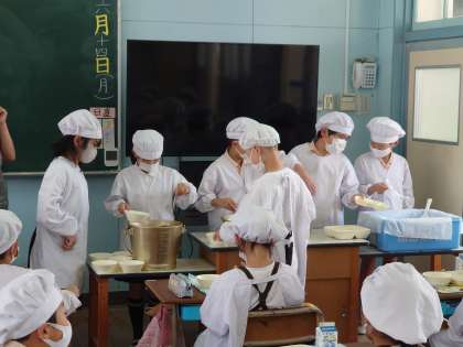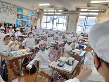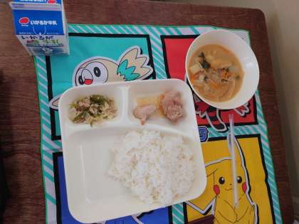 ご飯です。今日のお味噌汁は、少し大きめの揚げが入っていました。