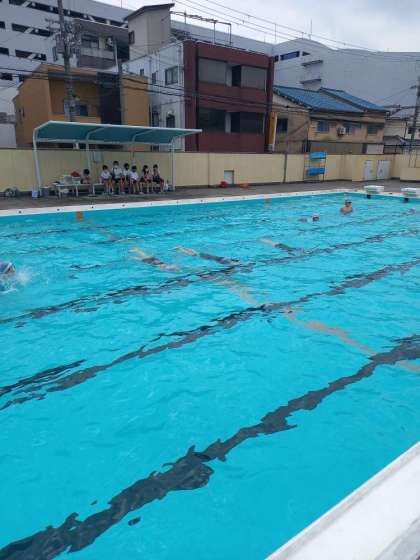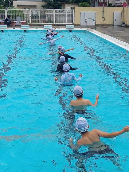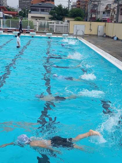 昨日1組がプールに入りましたが、今日は2組です。少し寒かったですが、元気いっぱいがんばっていましたよ。
