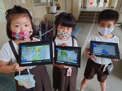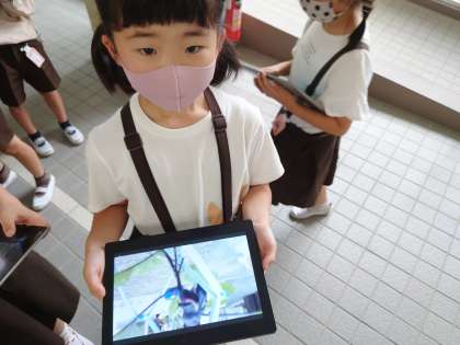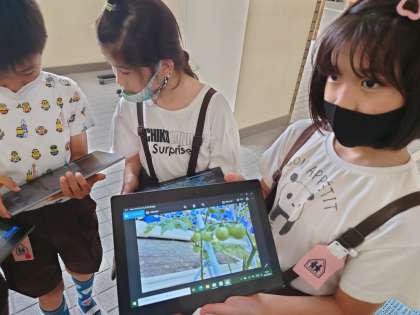 2年生がタブレットを使って、自分の鉢植えに育っている野菜を撮って教室に戻っていました。大きくなっているよ、もう少しで採れるかなとみんな野菜育てに熱中しています。