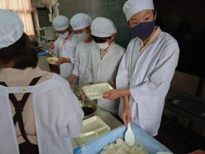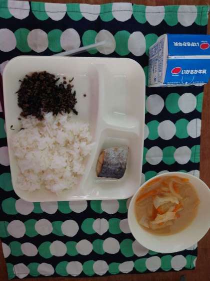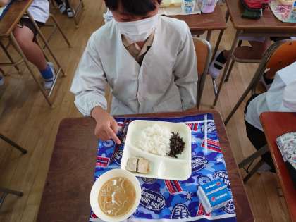 ご飯です。今日はひじきのそぼろをかけています。今日のおすすめを6年1組に聞くと、味噌汁、サゴシ、そぼろご飯と、悩みながら教えてくれました。大体同じくらいでした。
