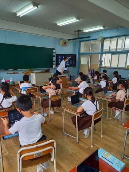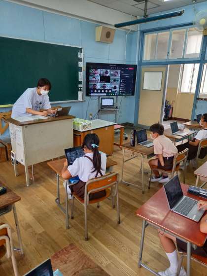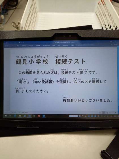 本日は土曜授業です。2年は今日の12時から接続テストを行います。子どもが一人でできるように操作の学習をしています。家でタブレット端末を操作し、接続画面が見れれば成功です。