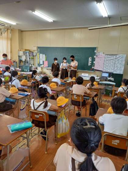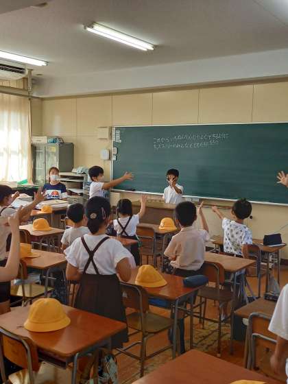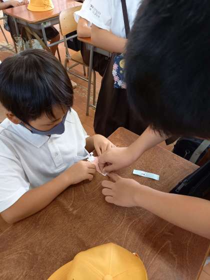 顔合わせ後、キッズファミリーの各教室に入り、自己紹介や班の中でのペア−などを決め、班のシールを低学年に貼ってあげていました。その後、キッズファミリーが仲良くなるためにみんなで遊びました。