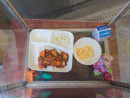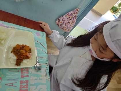 ハヤシライスです。給食調理員さんが星やハート型のラッキー人参を入れてくれています。くり抜いた残りももちろん入っています。入っている一年生の周りは大喜びです。