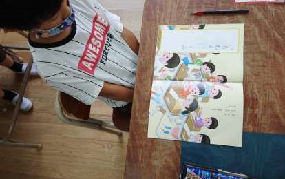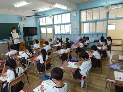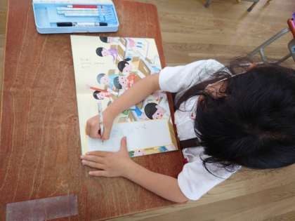 書写でした。教科書に書写たいそうが載っていて担任の先生と、首を押したり指を引っぱったりしていました。その後、集中してゆっくりと書いたり、なぞったりしています。