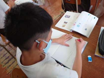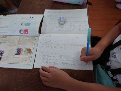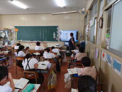 国語でした。教科書のなかま新聞を掲示し、みんなで気づいたことを話し合っていました。