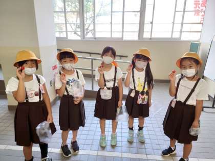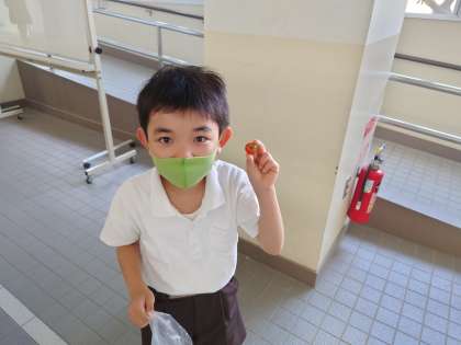 登校後すぐ2年生が職員室前を通っていました。念願のミニトマトがとれたようです。
