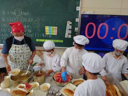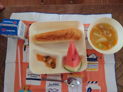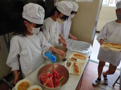 今日はスイカが人気のようです。玉を調理員さんがカットしてくれています。