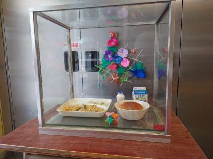 給食を運んでいます。調理員さんが献立見本の奥にセミとアサガオを飾ってくれています。