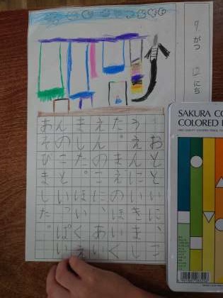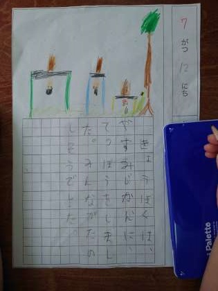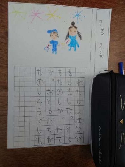 お隣のクラスは絵日記の練習です。これも国語の単元です。もうすぐ一年生初めての夏休み。絵日記の宿題もこれでバッチリですね。