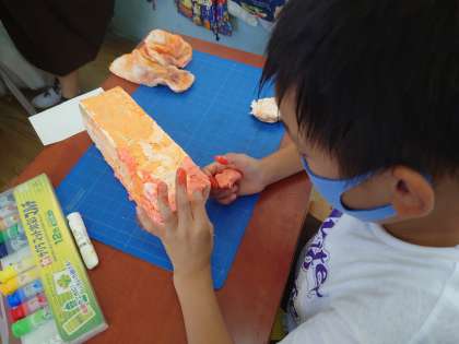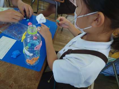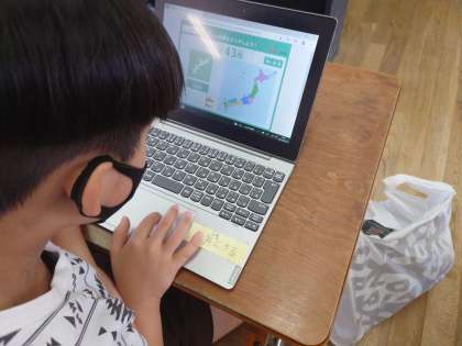 3年生が図工をしていました。終わっている児童はタブレットを使って自由研究を調べたり、社会の学習をしていました。