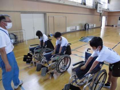 友達を車いすに乗せて介助の仕方を学ぶ介助体験を行いました。