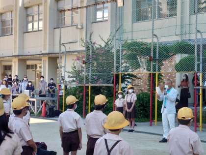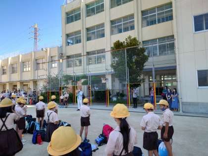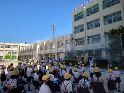 朝、開校式を行いました。校長先生や清水先生の話を聞きました。