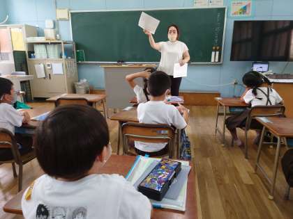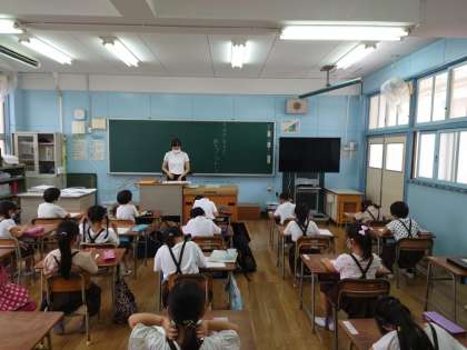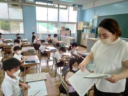 担任の先生の話を聞いたり、連絡帳を書いたり、夏休みの宿題を集めたりしています。
