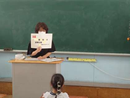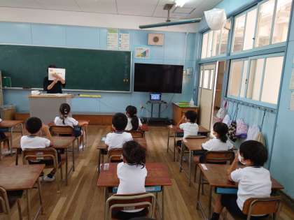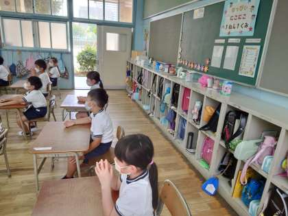 一年生が発育測定を受ける前に教室で保健の先生のお話を聞いていました。