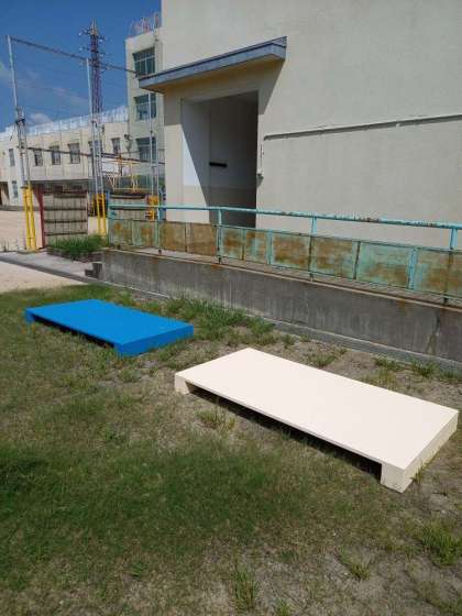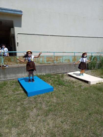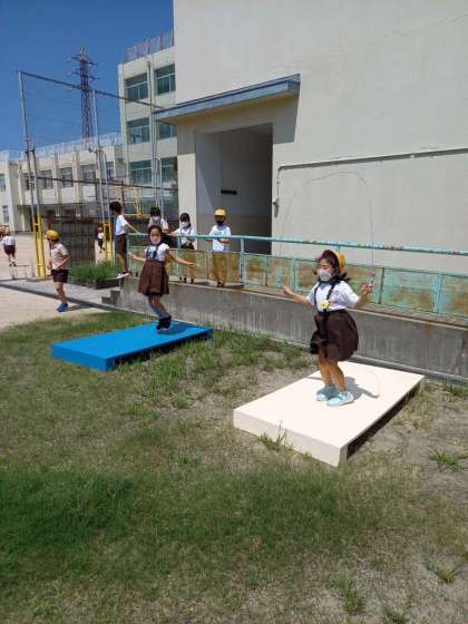 夏休み中に管理作業員さんが、短なわとびで使うジャンピングボードを2台作ってくれました。ジャンピングボードの上で、なわとびをすると板がたわむので、地面の時より高く跳ぶことができます。だから二重跳びも楽にできます。みんなしっかり使ってくださいね。