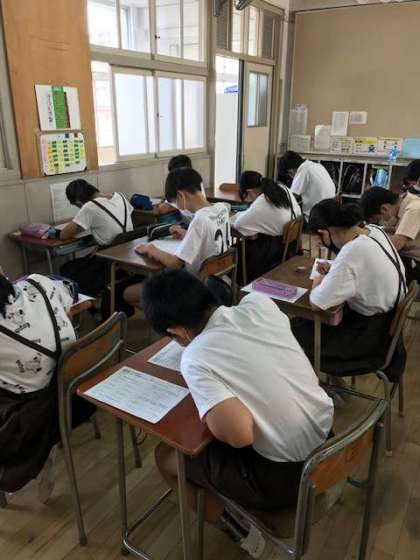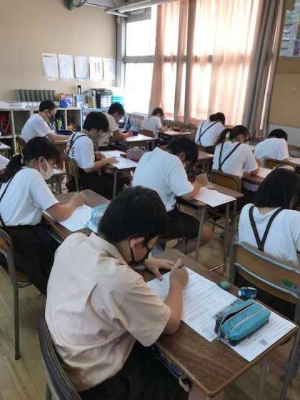 今日は夏休みに学習した、きわめる夏の国語、算数、社会の3教科でテストをしました。