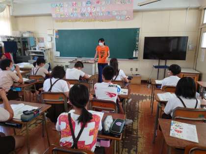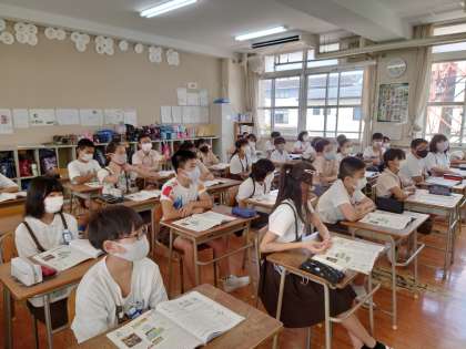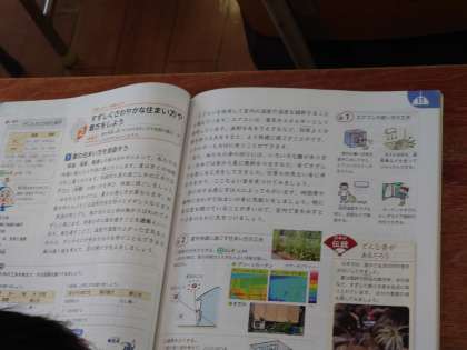 6年生は家庭科をしていました。夏の住まい方を見直そう、という学習で、冷房の使い方や風の通り方などの学習です。日頃の工夫や気温だけでなく湿度調整が大事であるということでした。