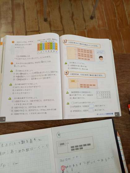 「10000より大きい数を表わそう」の単元について勉強しています。この時間は、370000は1000がいくつ集まった数字かなどの問題を解いています。