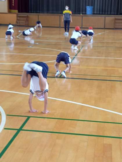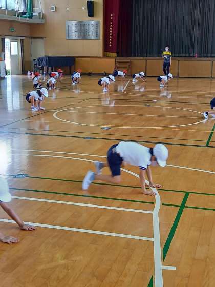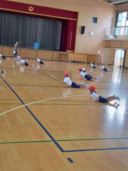 1年は3時間目に講堂で体育をしました。カエルの足うちなどの動きを練習していました。