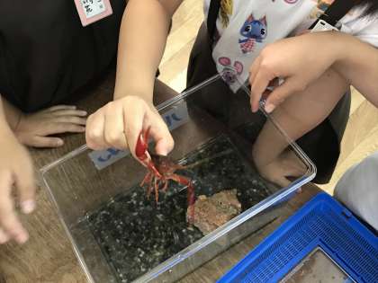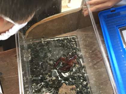 ザリガニが教室にやってきました。うれしくて大さわぎです。「初めてさわったよ」「手をはさまれた」「名前を決めよう」飼育の方法や注意を調べて、育てていきます。命の大切さを学んでほしいと思っています。