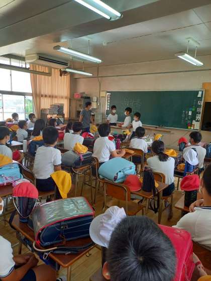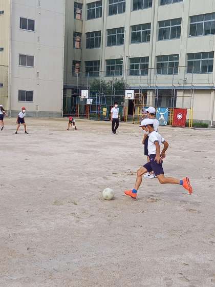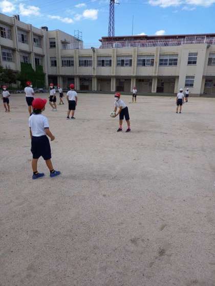 屋外スポーツクラブは、教室でチーム分けの後、運動場へ出て、次回から行うキックベースボールの練習をしました。