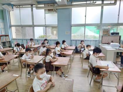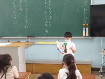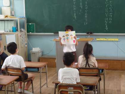1年生が夏休みの思い出を発表していました。楽しい思い出を絵にして発表していました。