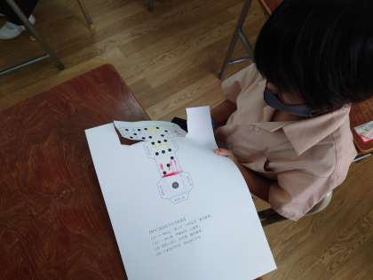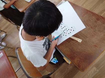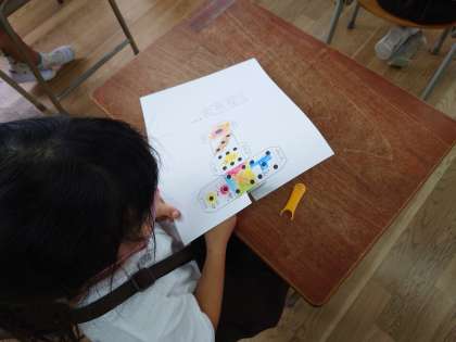 1年生おとなりは図工でサイコロを作っていました。ハサミの使い方を確認して切っていました。ハサミを動かすのではなく、紙を回しながら上手に切っていました。