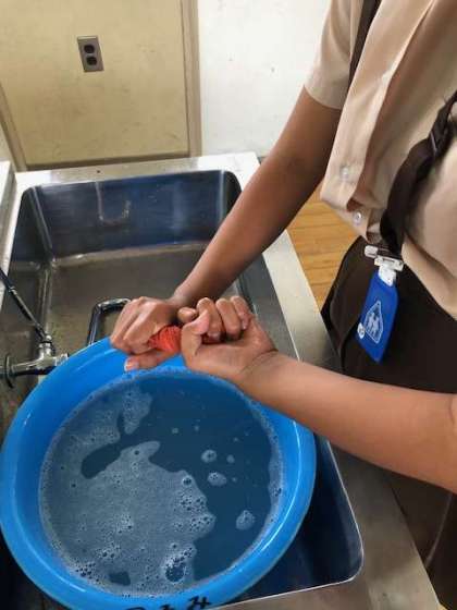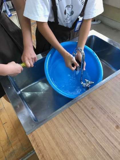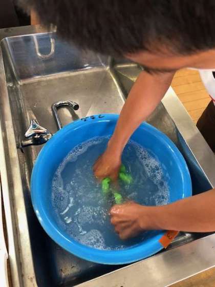 靴下を手洗いする方と、洗濯機で洗う方に分け、どちらが汚れが落ちるのか、どのように手洗いするのかなどについて学習しました。