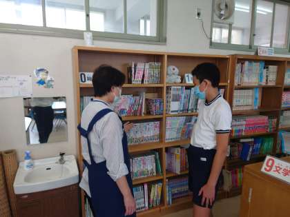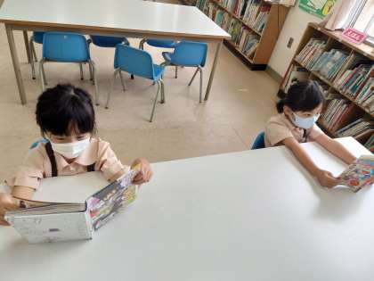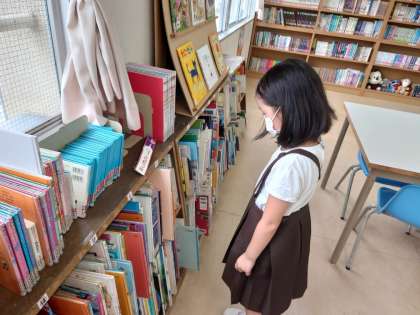 今日は1年生と4年生が図書室を利用できる日でした。少しずつ1年生が給食を終え、やってきました。