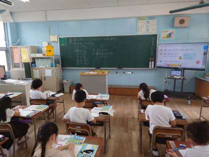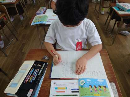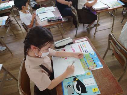 1年生が算数をしていました。ますのいくつ分で長さを表していました。