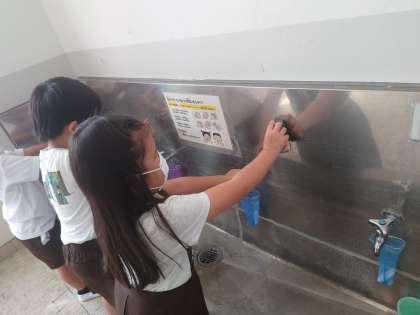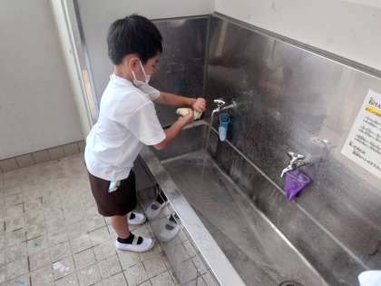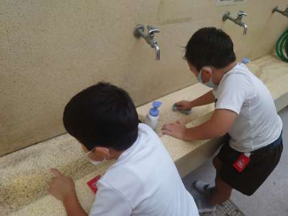 手洗い場をきれいにしていました。雑巾も頑張ってしぼっていました。