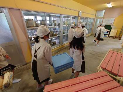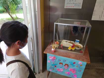 3年生が手を洗ったときにメニューをのぞき込んでいました。