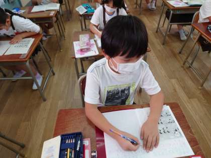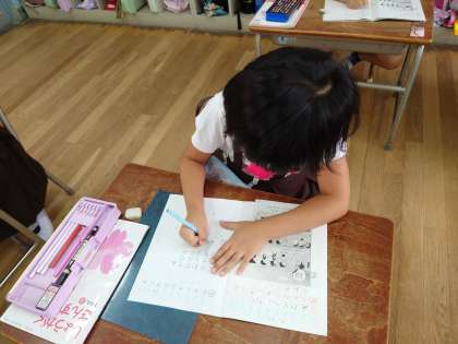 1年生おとなりでも算数をしていました。3つの数のたし算です。
