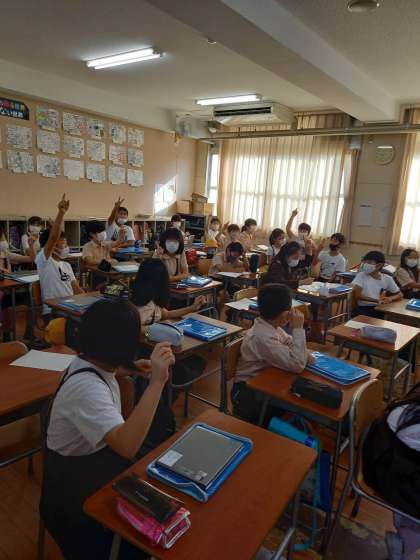 今日の児童集会は、イントロクイズです。放送室から問題を出しました。教室では、ハンドサインで答えていました。