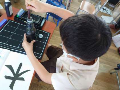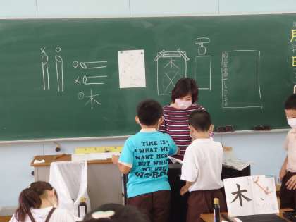 3年生が習字をしていました。木という字です。「小文字の練習」と練習で書いた半紙に何度も名前の練習をしている子がいました。