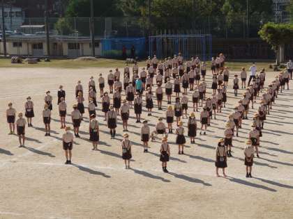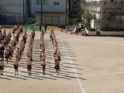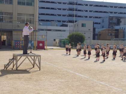 いいお天気にも恵まれ久しぶりに運動場で全校朝会を行いました。
