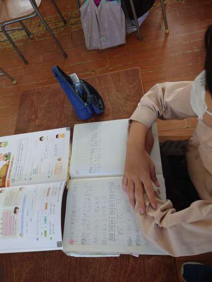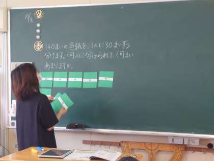 4年生が算数をしていました。140÷30の学習です。10をもとにして計算すると4あまり2になりますが、30で割っているのであまりは20ということを学習します。