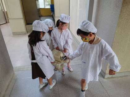 1年生は食器のかごを四人で運んでいます。