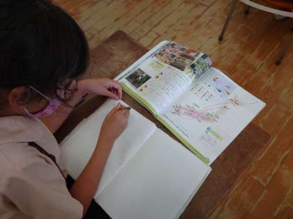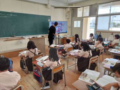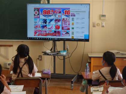 3年生が社会をしていました。スーパーの広告を見ながら品物はどこからきたか学習していました。