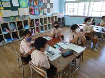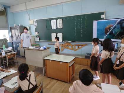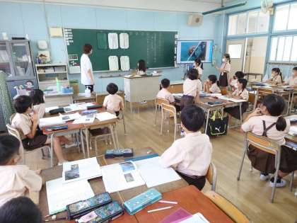 2年生が国語をしていました。ビーバーの大工事で、グループ学習をしていたようです。