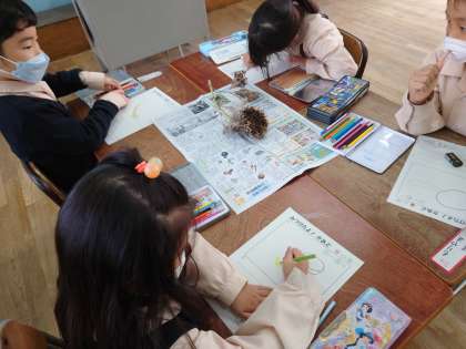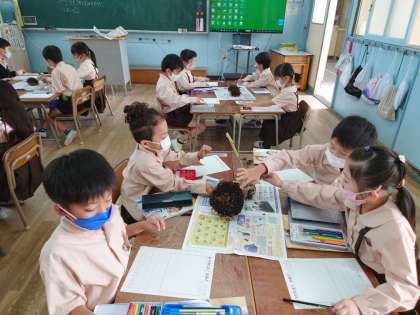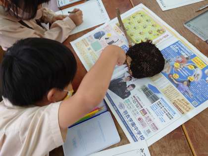 一年生が生活の学習をしていました。枯れたひまわりを観察していました。種がどんなふうにできているか興味津々でした。