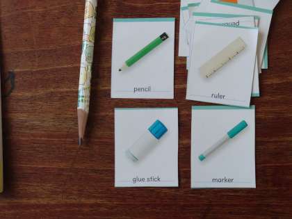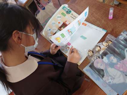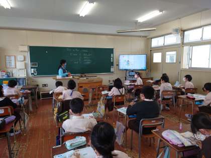 4年生おとなりは英語をしていました。文房具カードを使って学習していました。