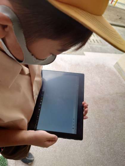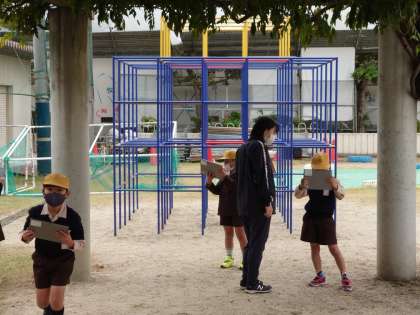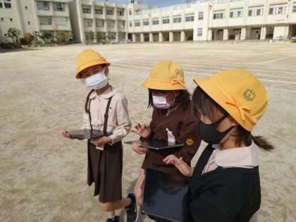 2年生がタブレットを使っていました。お気に入りの遊具を撮っていました。それを教室で先生に提出します。