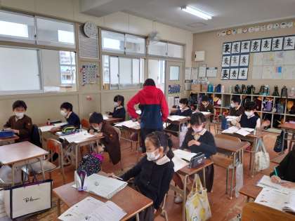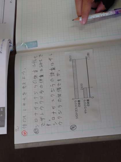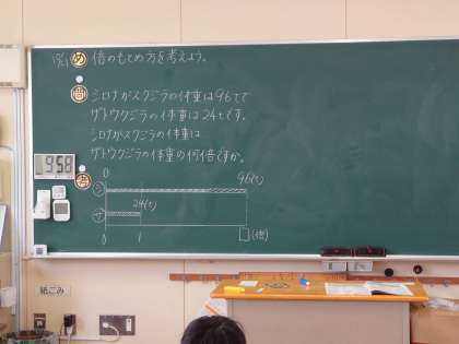 4年生が算数をしていました。今日は4時間目に体育をするようで、時間変更して行っているようです。倍の求め方ですが、倍なのに割り算を使うよという問題文を読み込まないといけない学習です。