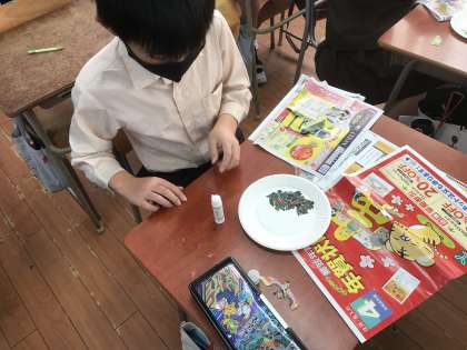 まずは、切り株の下の部分に、葉っぱが敷き詰められているイメージで、紙皿に緑系の紙を貼り付けていきます。児童みんなが家から持ってきてくれた、チラシや雑誌をちぎって貼り絵にしています。